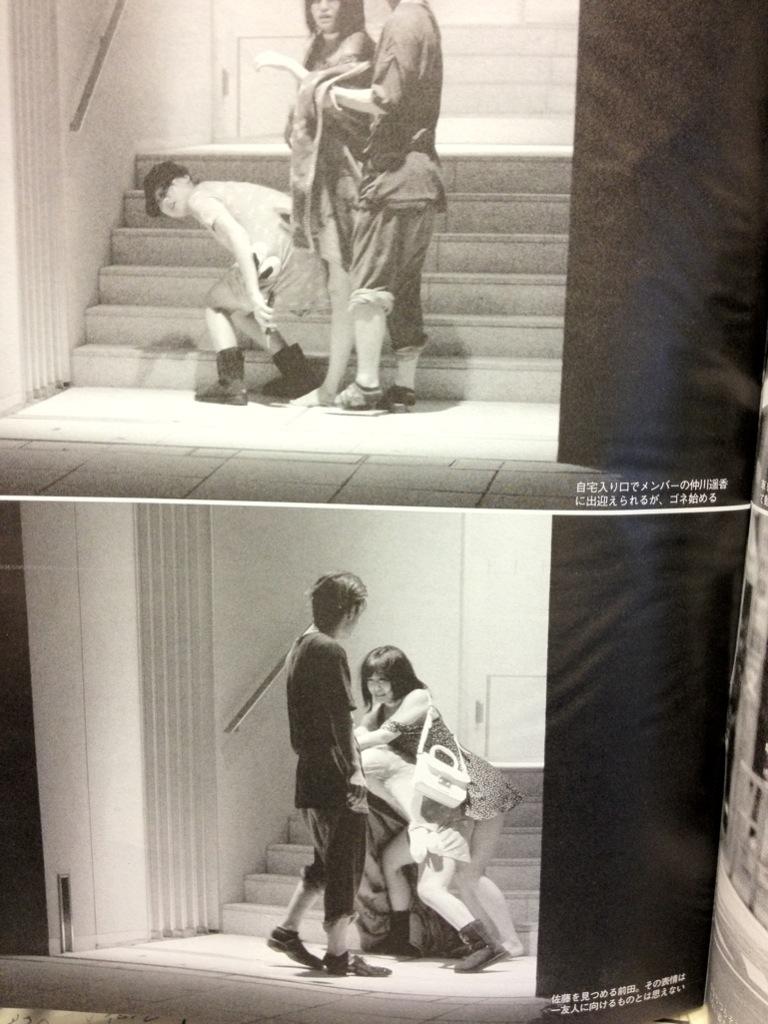 麻布十番で、AKB48の大島優子、仲川遥香とともに佐藤健らとの合コンに参加。その合コン終了後、泥酔状態の前田は、佐藤に“お姫様抱っこ”をされる形でタクシーに乗り込み、自宅まで送り届けられたという。誌面には、佐藤がお姫様抱っこをした際にお尻が丸出しにな |